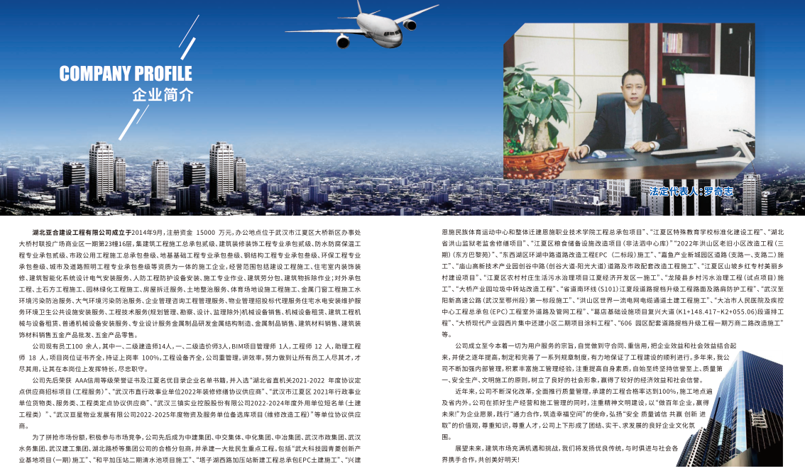 湖北亞合建設工程有限公司成立于2014年9月,注冊資金15000萬元,辦公地點位于武漢市江夏區大橋新區辦事處大橋村聯投廣場商業區一期第23幢16層,集建筑工程施工總承包貳級、建筑裝修裝飾工程專業承包貳級、防水防腐保溫工程專業承包貳級、市政公用工程施工總承包叁級、地基基礎工程專業承包叁級、鋼結構工程專業承包叁級、環保工程專業承包叁級、城市及道路照明工程專業承包叁級、施工勞務資質等資質為一體的施工企業。